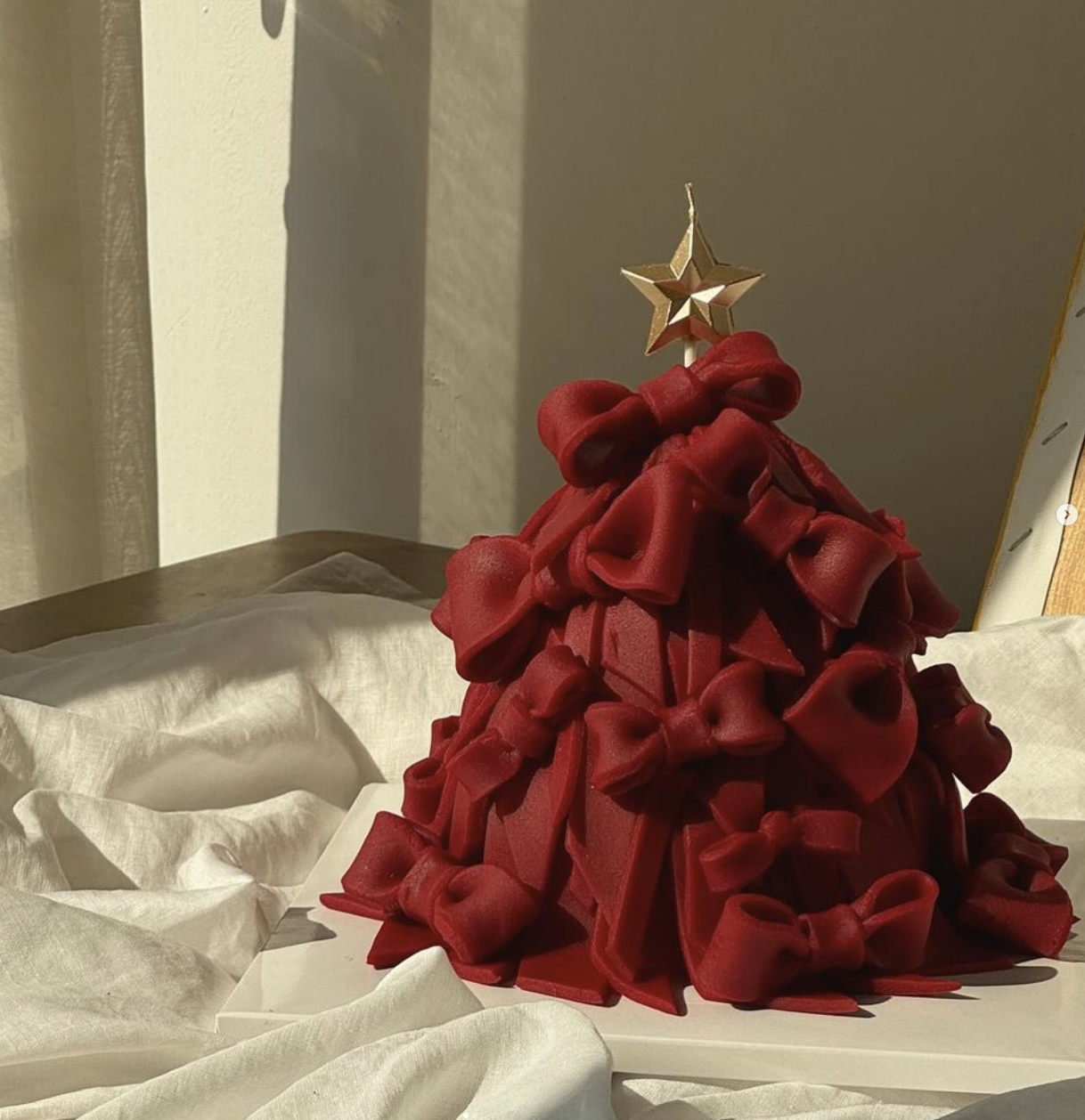 크리스마스 분위기에 딱 맞는 리본으로 만들어진 아름다운 트리 모양의 케이크입니다.